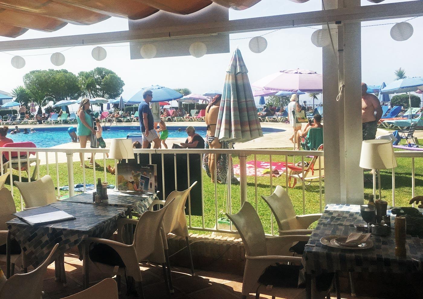 Die Poolanlage ist wie ein großer See mit Felseninsel angelegt und mit Rasen als Liegefläche umgeben, mit herrlichem Blick über Nerja und das Mittelmeer. Es gibt auch einen Kinderpool für die Kleinen.
